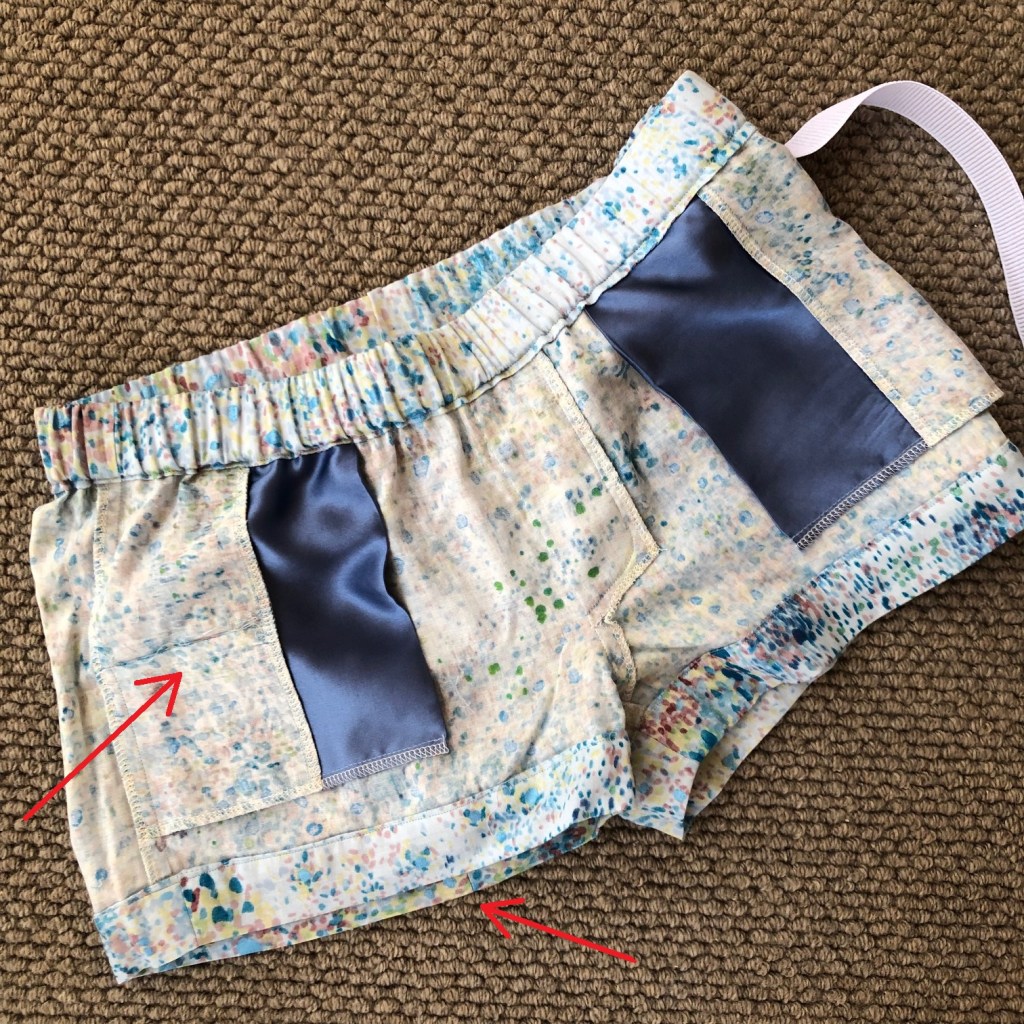 Thanks to the popularity of this pattern amongst my IRL sewing friends, I’d been able to try on the size 14 and size 12 back in early pregnancy, landing on the former for the pj top and latter for the pj bottoms, meaning I could completely escape muslining, yay! I’d need to stick to making the shorts, as this fabric is a mere 106cm wide (!!) so squeezing everything out of the 2.4m length I had was tight – I had to piece together one of the shorts cuffs (I picked the bit at the back, of course) and the inner pockets were made from a pieced together backing and finished mostly in the trim fabric. There was a tiny pile of scraps at the end of it all – which at least felt like I was making the most of it!