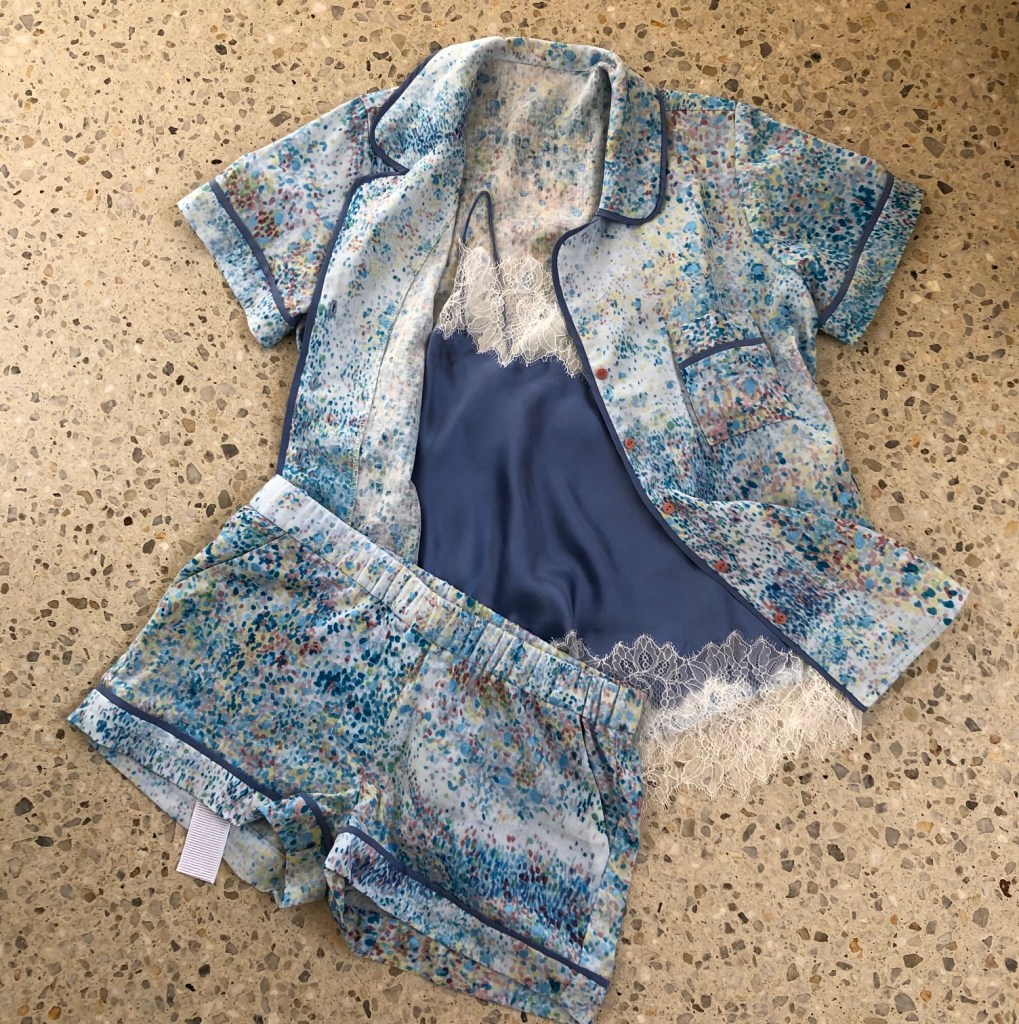I bought some maroon fabric to highlight the wine coloured splotches in the Nani Iro – to be used as contrast piping (and the part of the shorts pocket bag I couldn’t eek out from the scraps) – but ended up not using this and instead using the leftover cornflower silk from my Bias Cami – the one I made with Tatyana Design (she’s now opened a couture sewing school – check it out!) Admittedly, I’ll more likely be teeing these pj’s up with a stretch cotton nursing singlet for now, the bias cami will have to wait!