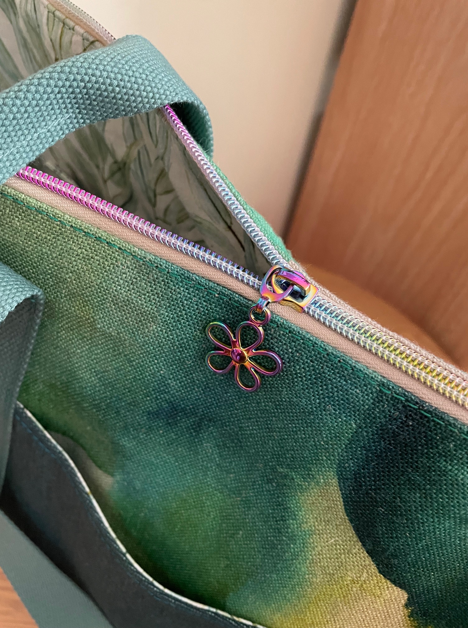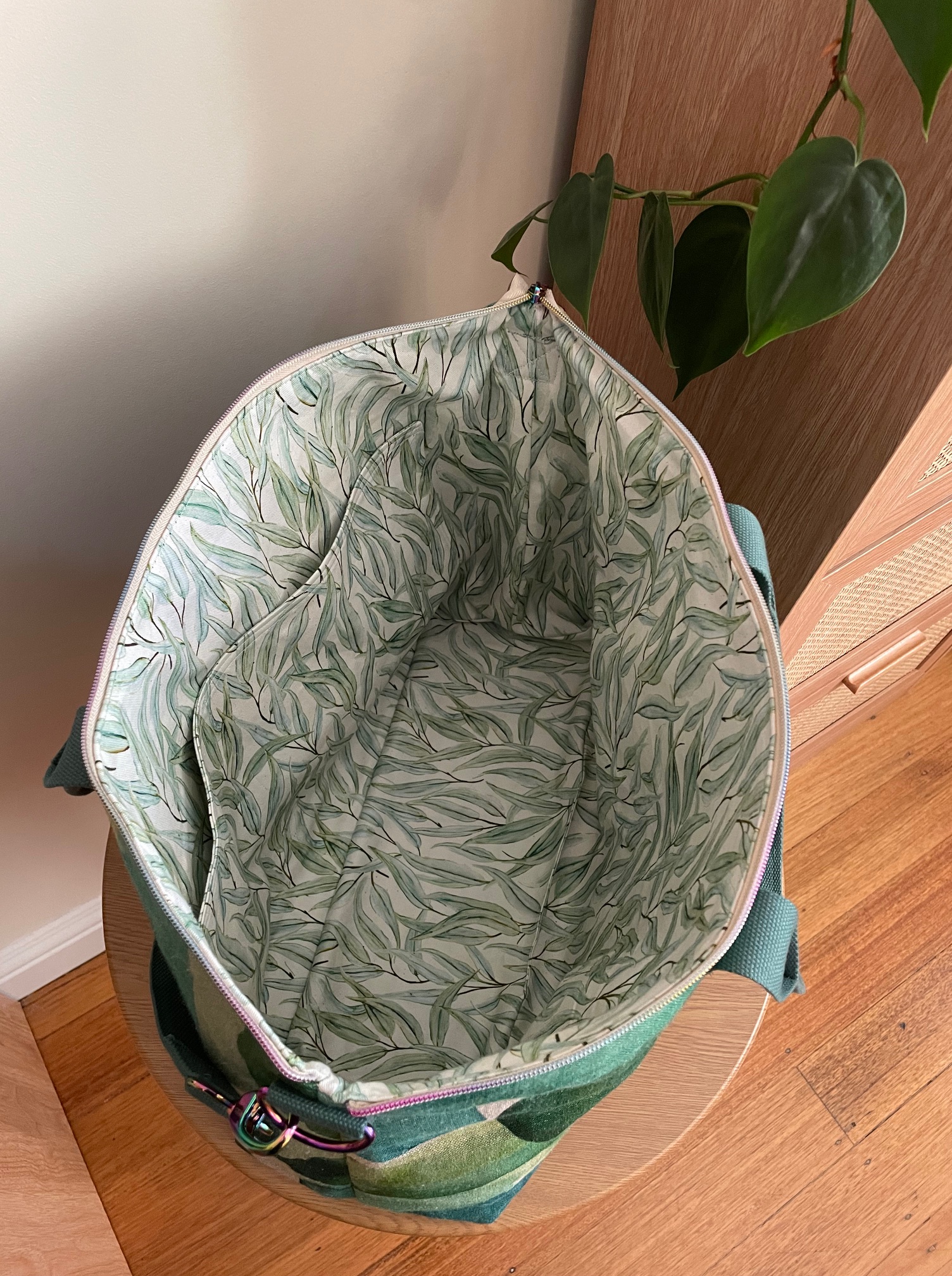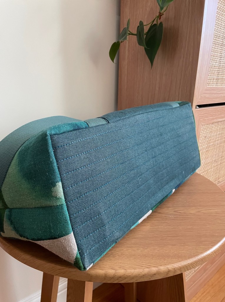 Lining fabric is a cotton canvas from Spotlight, in a lovely eucalyptus leaf print with blue and greens to tie in to the BlueBellGray watercolours, and the base of the bag is a heavyweight green canvas from FibreSmith, which I’ve quilted to attach the sew in interfacing (also from Voodoo Rabbit Fabrics). Voodoo deserves a special shout out because of how they packed my interfacing – it was wound up on a slim cardboard box so as not to have fold lines in it – which would impact the sewn outcome – so thank you Voodoo Rabbit Fabrics – that kind of attention to detail makes me feel all warm and fuzzy!!!!