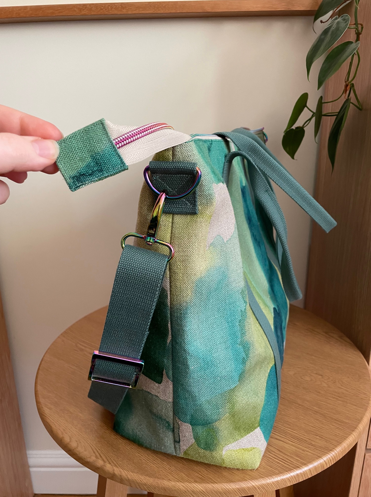 The outer fabric is a heavy upholstery weight linen from BlueBellGray, in a print that I can’t recall the name of and seems to not currently be in production. I managed to find (on the Noodlehead website, no less!) cotton webbing that was the most ideal match for this range of stormy greens, teals and blues!