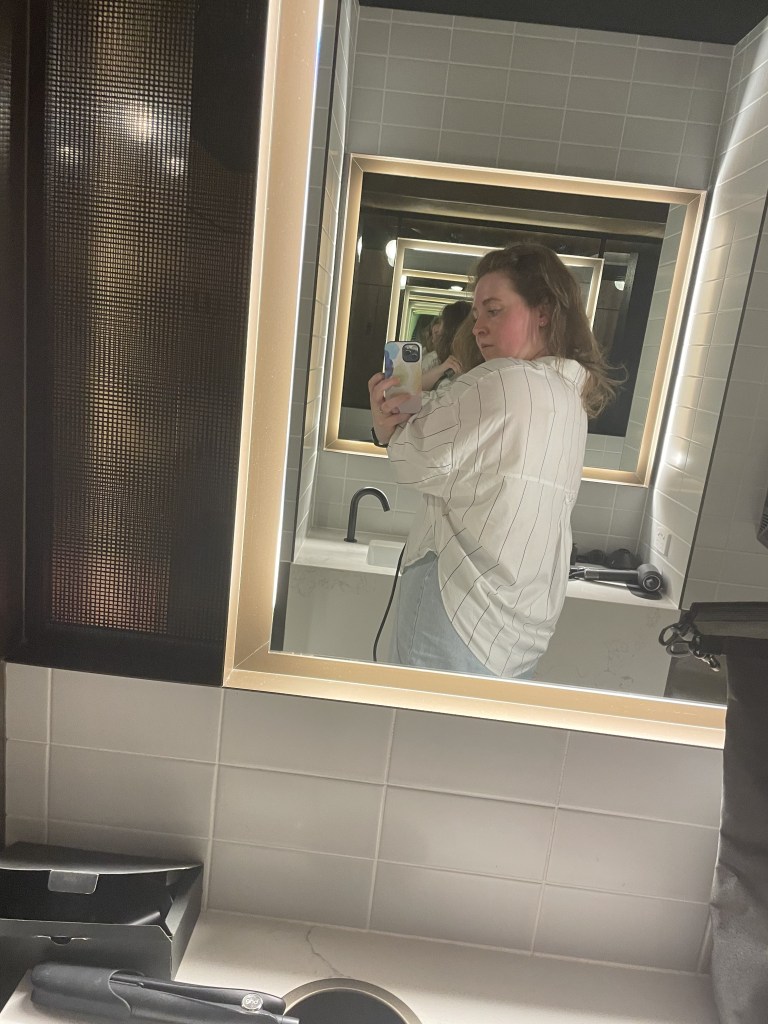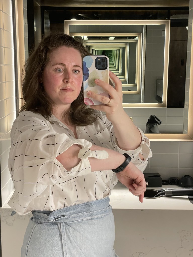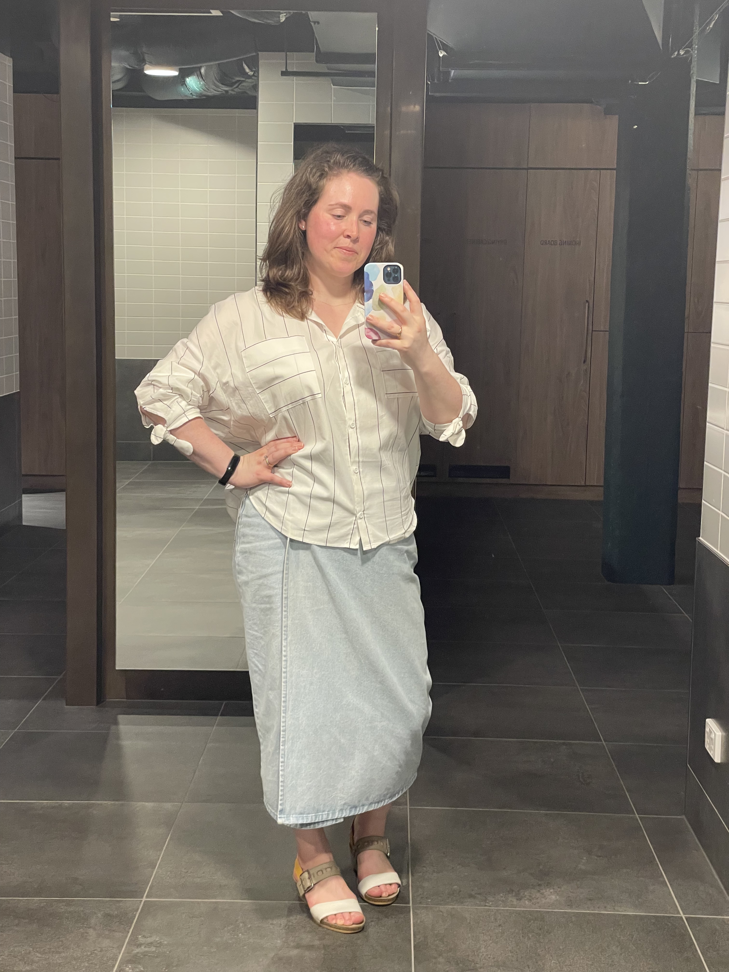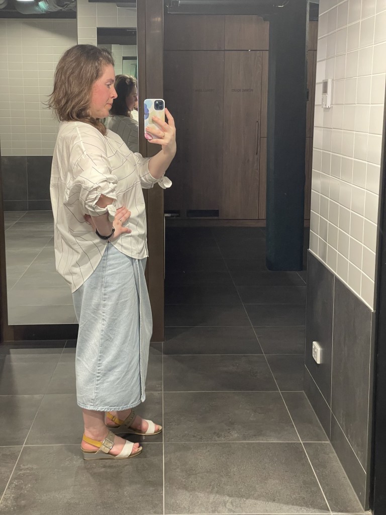 I also preferred it tucked in to untucked. I was more comfortable with the silhouette when it had some waist definition. But I have also worn it out and about with jeans and felt fabulous, so there is that. I’ve entered my comfortable-and-don’t-care era.