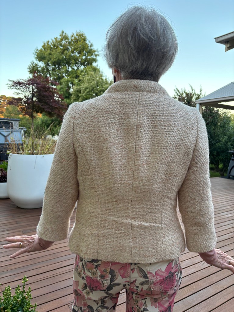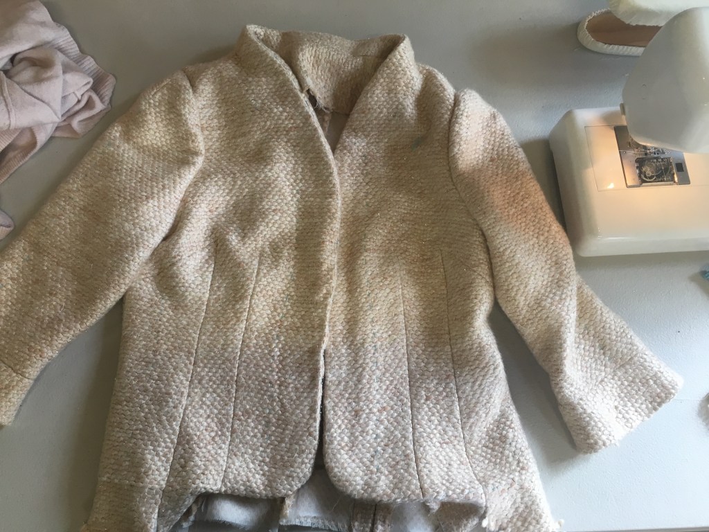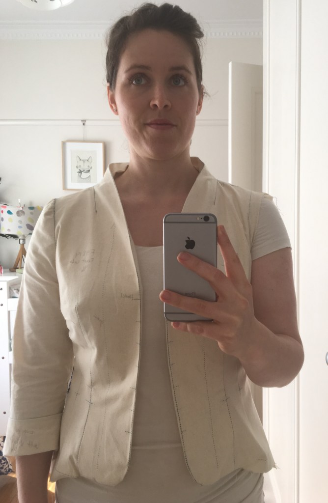 At this stage, when I was trying the constructed shell on, someone in the class threw out a flippant comment that they thought it was very ‘wedding-y’ (I don’t believe it was meant in a flattering way) – which actually really threw me – especially as I was planning for this to be a work jacket! I do still think this would look good with jeans and white shirt, and if it fit me now, this is how I would wear it.