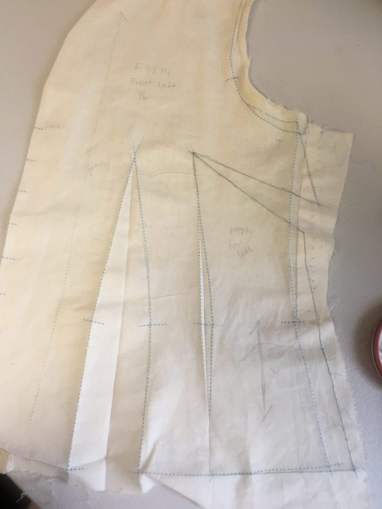 Adjustments Susan did end up making were around fitting across my chest – we ended up adding in extra at the side seams, then creating a side front pattern piece from the diamond dart across, to take care of the dead dart emanating from the side seam that needed to be removed. And that was largely it, so I pretty quickly got stuck into the real thing.