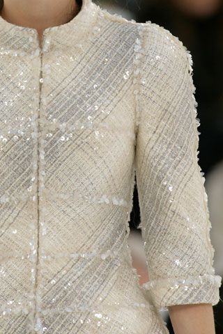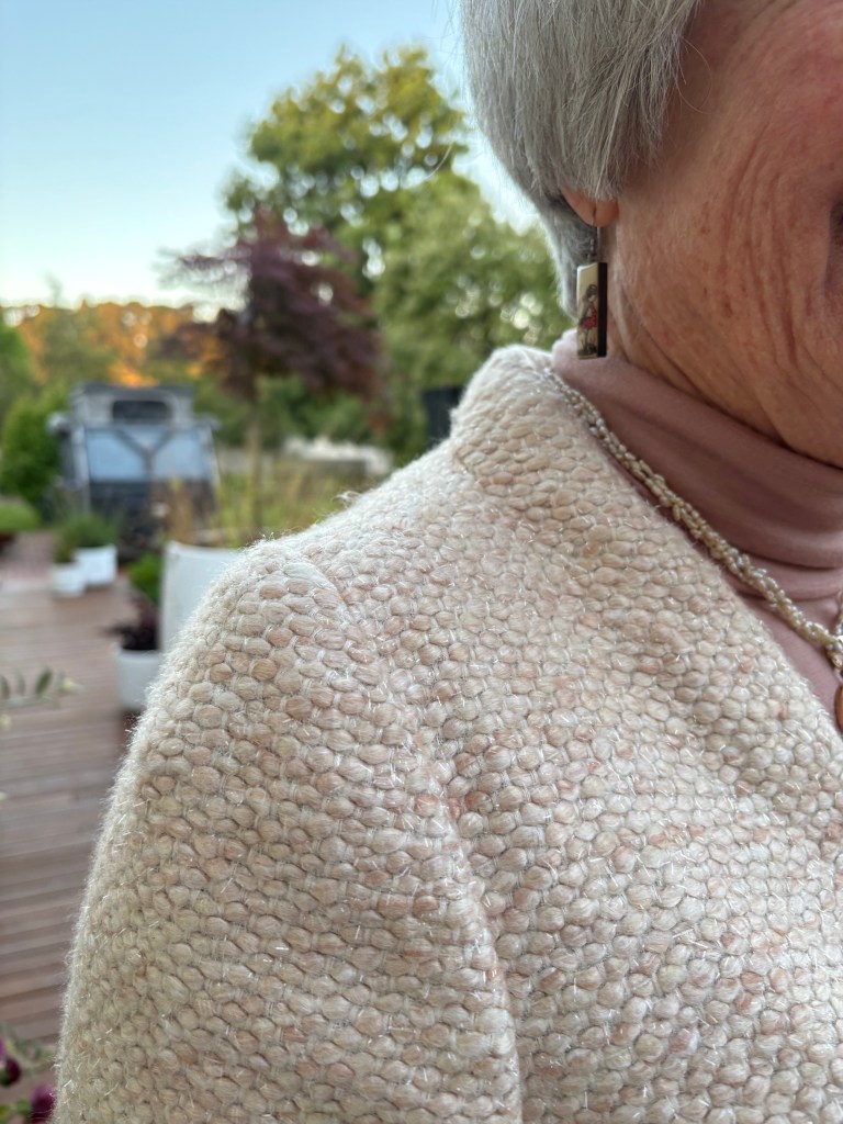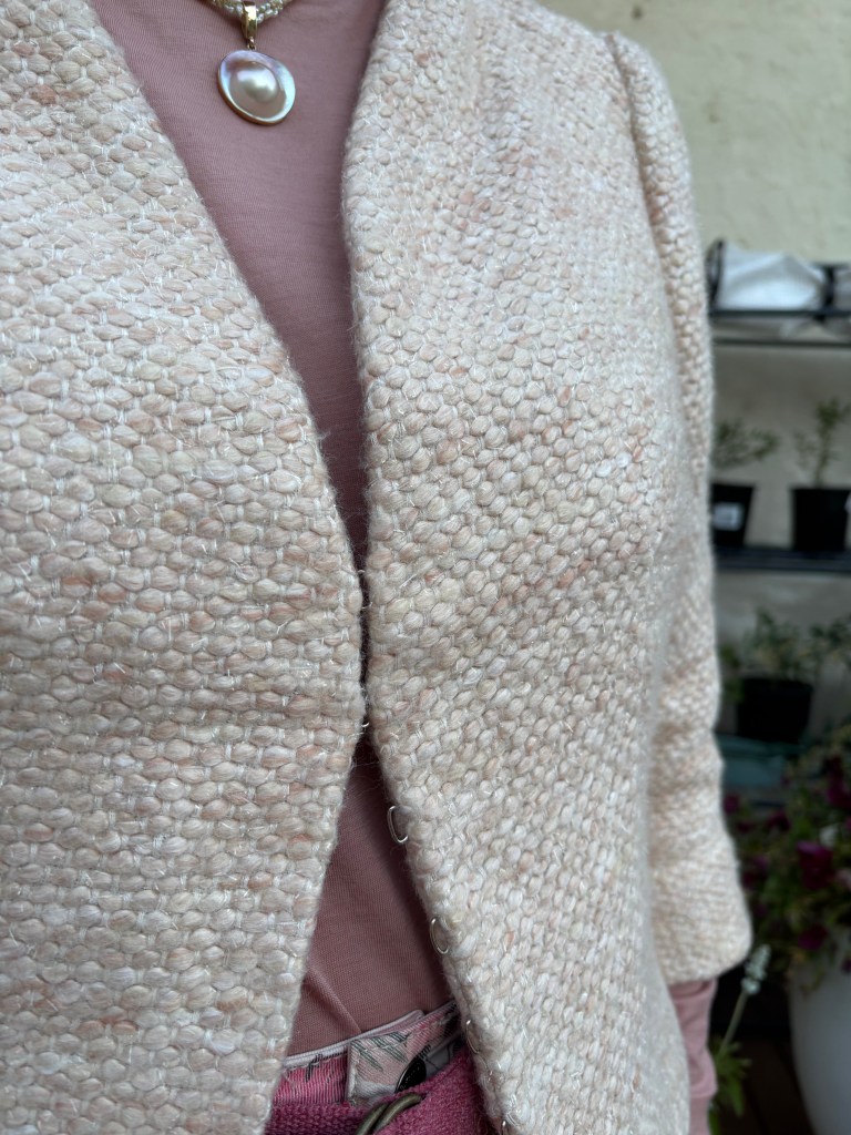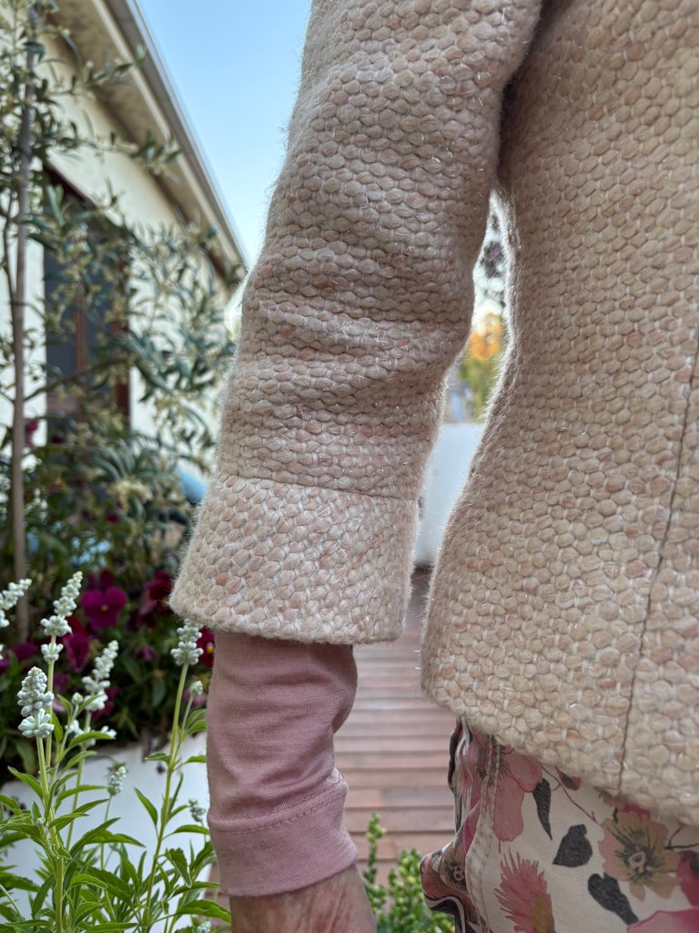 One of my favourite things about Chanel’s iconic cardigan jacket is how they take advantage of the boucle’s workability and talent at absorbing hidden seams to get really rounded sleeve caps – so that the armscye seam appears to head directly vertical up from the armpit: