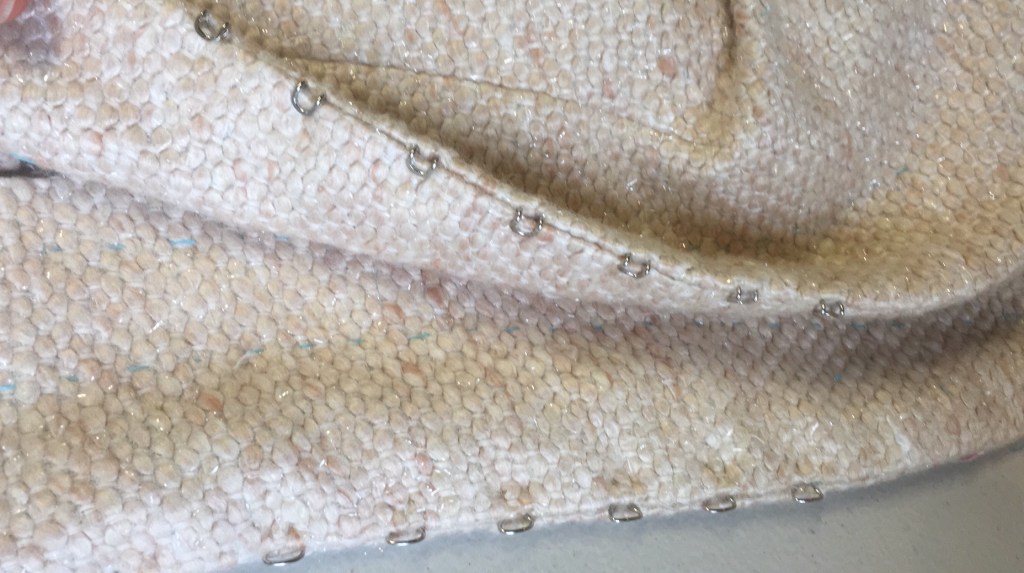 I did this by marking out their locations, then sewing the jacket facing on with my machine – stopping and starting each side of the desired hook/eye location, leaving just enough space to push one through to the other side – securing in place with hand stitched to the seam allowances (and catching the organza underlining of the front jacket piece, for extra stability.