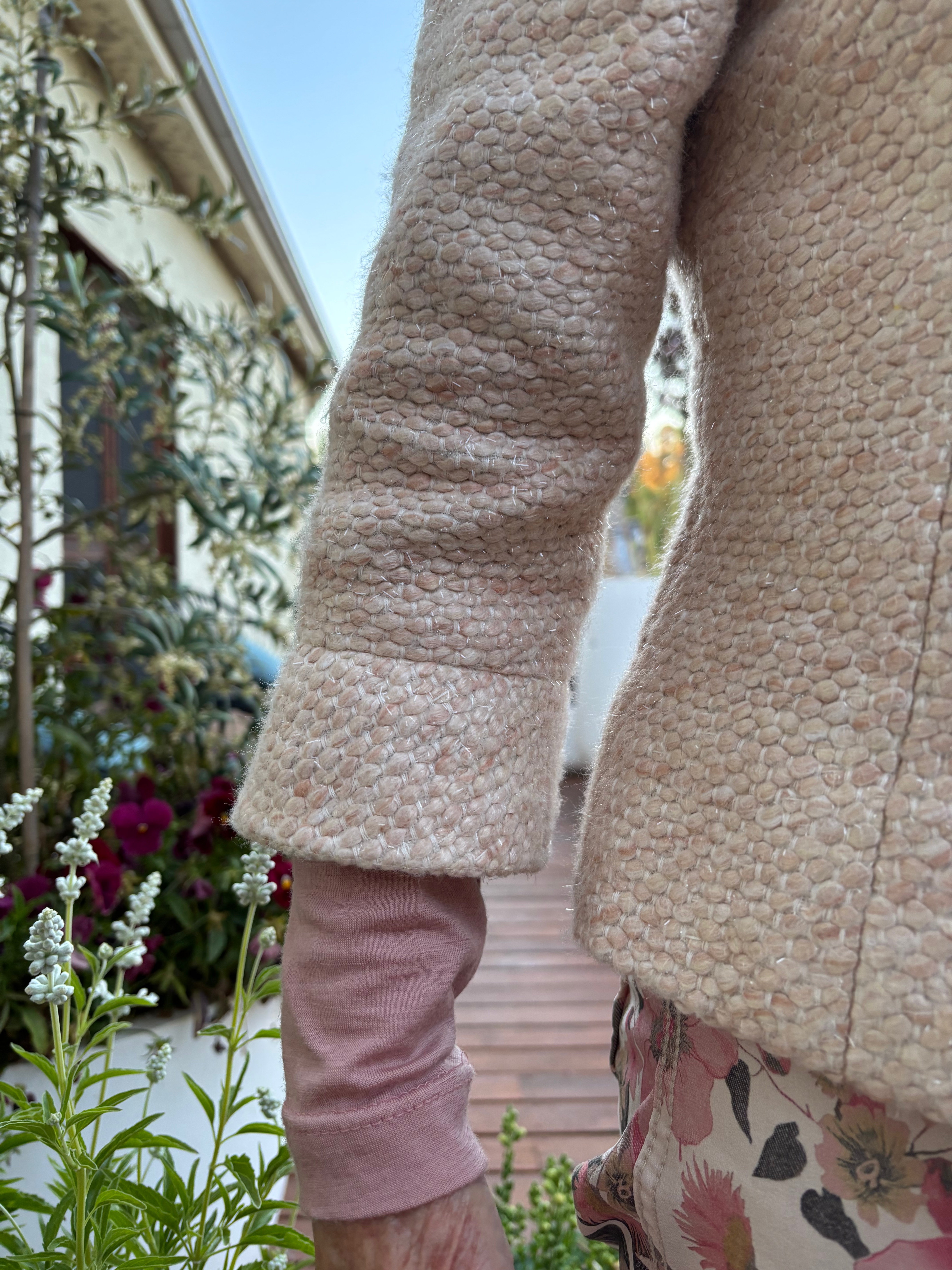 For the lining, I had struggled to find a matching peachy/apricot coloured charmeuse – with Tatyana coming to the rescue back during the class with some ‘mushroom’ coloured silk satin that she had in stock, which was perfect and of course I bought it. It was only recently that I sewed in the lining by hand – probably my favourite part of sewing jackets like this: