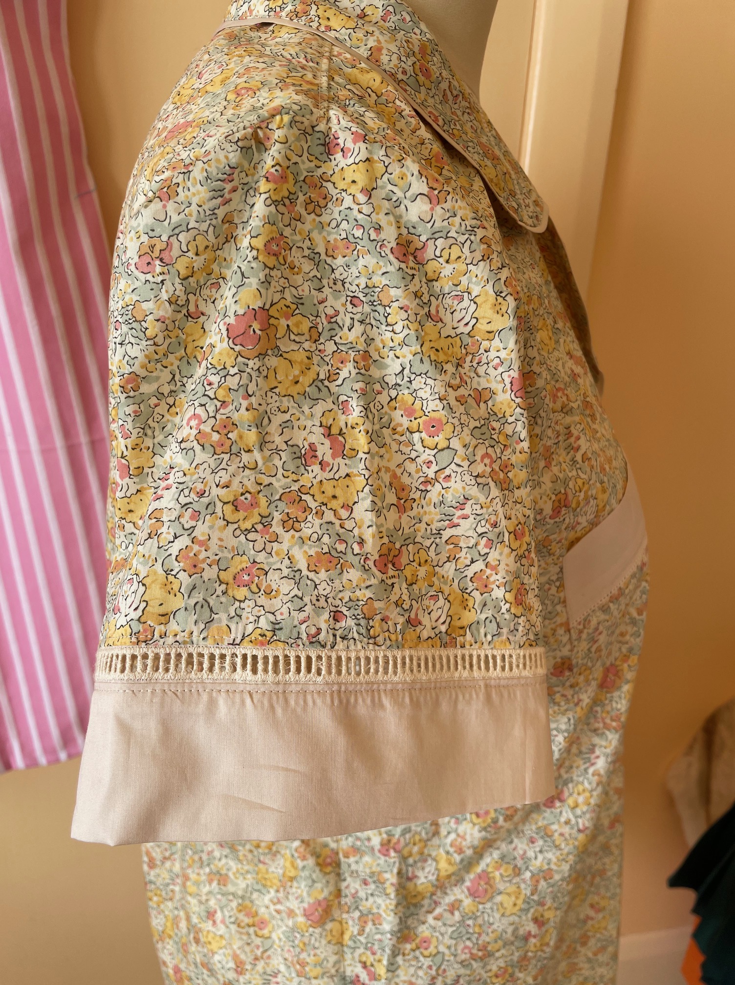 I bought this Betsy Liberty fabric before I got married, always with the intention to make pajamas with. I recently bought a bunch of different Entredeux (fagot) trim and was not able to use as much as I was hoping to – after discovering that the trim did perfectly match this fabric, these pyjamas skipped right to the front of the sewing queue!
