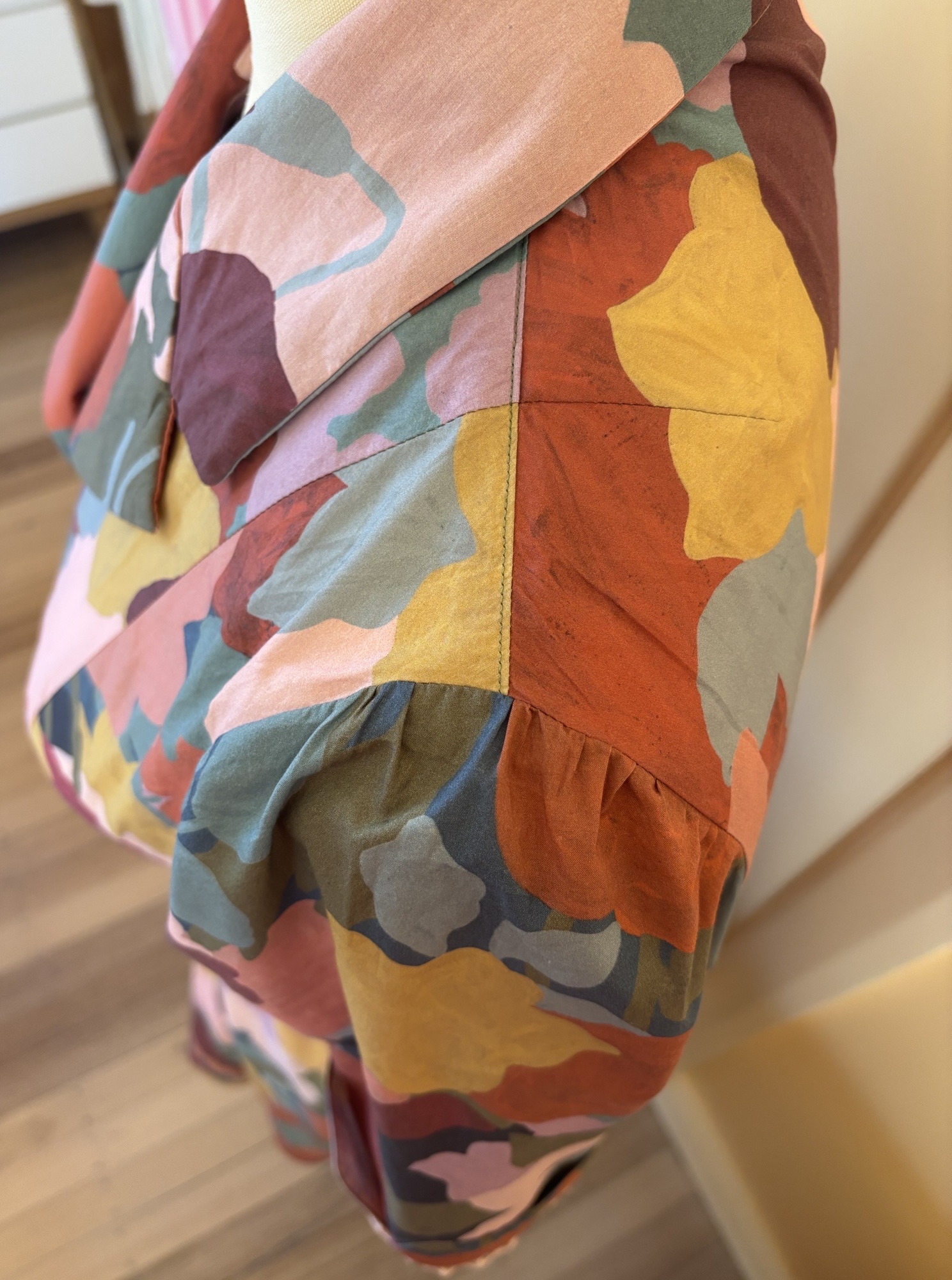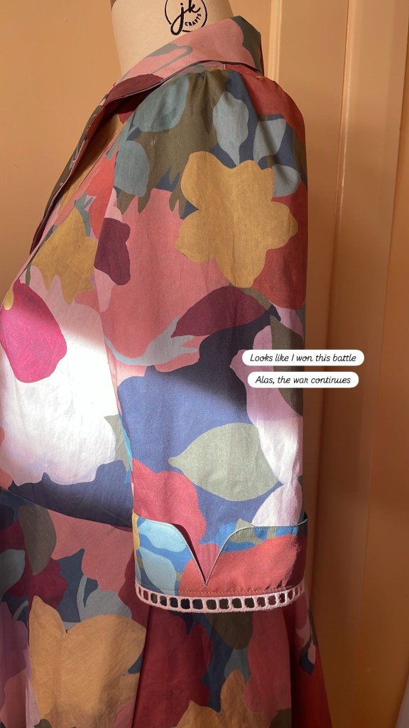 I spent nearly a day cutting all the skirt pieces out – matching the skirt rear seam and front button placket patterns… I’d cut one panel, then find the pattern repeat, and put the next panel up against the now camouflaged piece to get the right placement. It worked really well – I got it right on both the centre front and centre back skirt seams – perfect match. Looks like I picked the wrong ‘join’ spot with the front bodice unfortunately – this ended up being a way off! It’s harder when there is a button placket in the mix.
